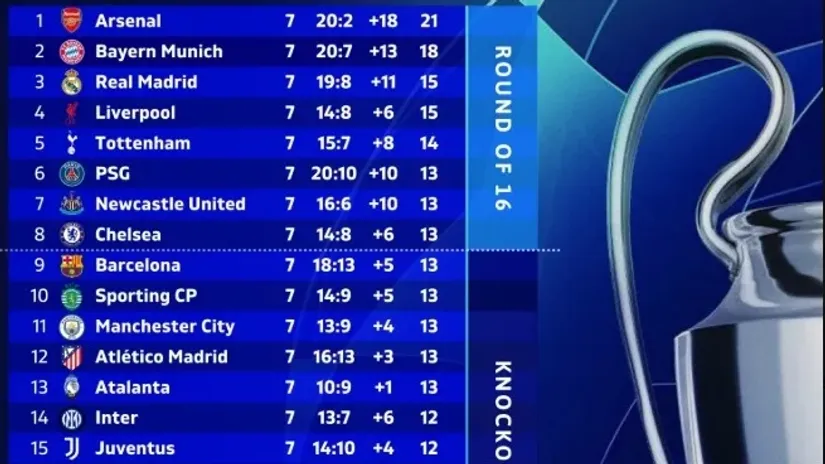 Njih 15 je sigurno u nokaut fazi: Arsenal, Bajern, Real Madrid, Liverpul, Totenhem, PSŽ, Njukasl, Čelsi, Barselona, Sporting, Mančester Siti, Atletiko Madrid, Atalanta, Inter i Juventus. Podsetimo, mada teško da to neko ne zna, prvih osam ima direktan prolaz u osminu finala, dok će ekipe od devete do 24. pozicije razigravati u plej-of rundi u februaru, gde će plasman na tabeli imati presudnu ulogu za određivanje parova, uz blagu asistenciju žreba.