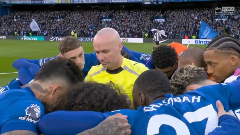 Glavni sudija bio je na centru, unutar kruga, prišli su mu fudbaleri Čelsija i opkružili ga. Kol Palmer u jednom trenutku mu je naslonio ruku na rame, potom je usledio motivacioni govor domaćin fudbalera, a Pol Tirni je, reklo bi se, bio u čudu.