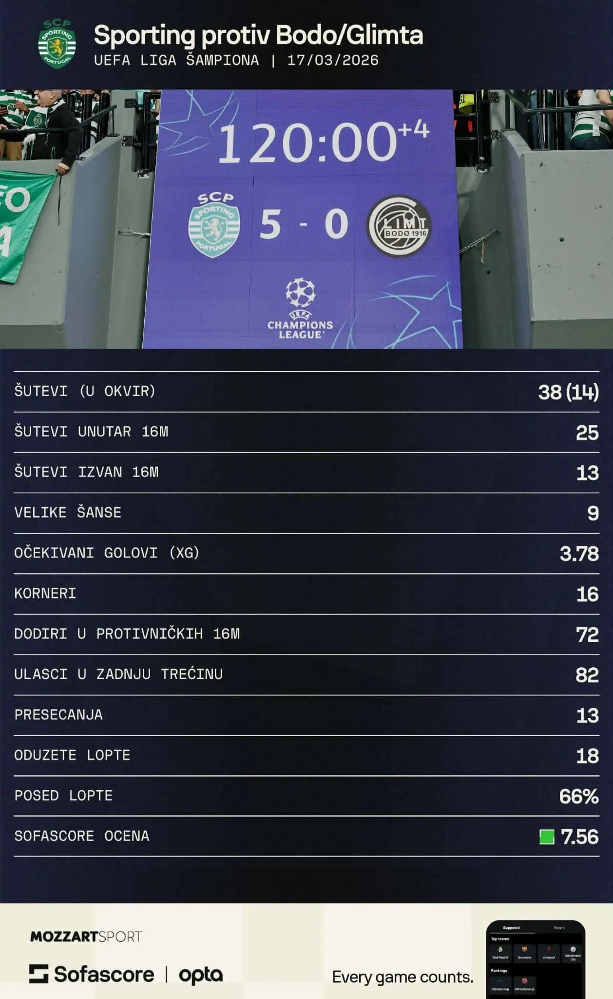 Ogroman podvig napravio je Sporting sinoć, ali daleko od toga da se plasman portugalskog šampiona može smatrati za iznenađenje, izuzimajući rezultat prve utakmice (u kojoj su zbog žutih kartona bili bez srca i duše tima, Pedra Gonsalvesa). Podsetimo, zeleno-beli su ligašku fazu završili na sedmom mestu i plasirali se direktno u osminu finala kao jedini klub van Liga petice (i jedini među prvih 17). Pobedili su ove sezone sve mečeve kod kuće (PSŽ, Olimpik Marselj, Klub Briž, Kairat i sada Bode), kao i Bilbao u gostima, a igrali nerešeno sa Juventusom u Torinu... Za razliku od Bodea, Sporting je potrošio skoro 90.000.000 evra na pojačanja, ima u svojim redovima Mortena Hjulmanda čija se vrednost procenjuje na 50.000.000 evra, najveću nadu portugalskog fudbala Živanija Kvendu koji je za sličnu sumu već prodat Čelsiju, dvojicu od po 45.000.000 (Gonsalo Injasio, Usman Diomande), još šestoricu koji po Transfermarktu vrede 20 ili više miliona evra... Pritom, protiv Bodea u oba meča zbog povreda nisu igrali pomenuti Kvenda i letošnja akvizicija iz Panatinaikosa, Fotis Joanidis.