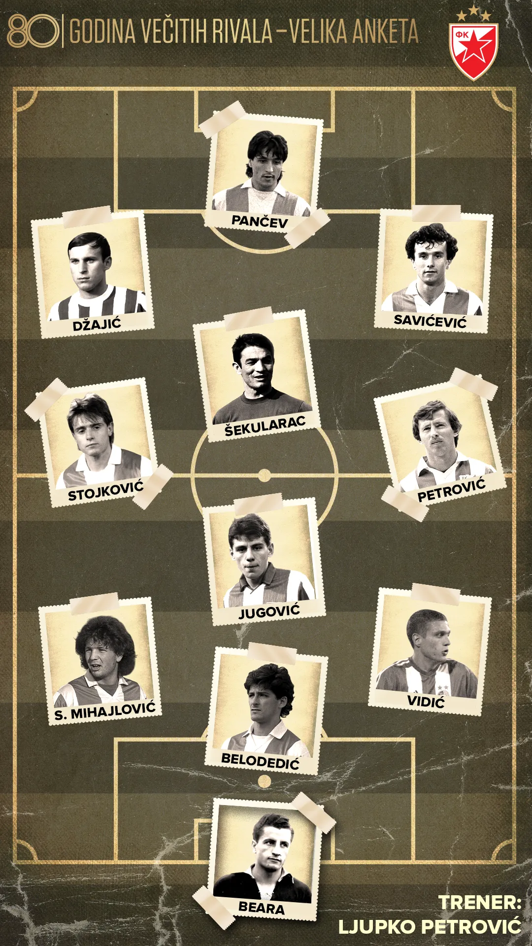 IDEALNIH 11 CRVENE ZVEZDE SVIH VREMENA U IZBORU PUBLIKE: Vladimir Beara (37,2%) - Nemanja Vidić (81,0%), Miodrag Belodedić (81,3%), Siniša Mihajlović (85,7%) - Vladimir Jugović (48,8%) - Vladimir Petrović (59,3%), Dragoslav Šekularac (63,7%), Dragan Stojković (62,1%) - Dejan Savićević (65,5%), Darko Pančev (51,0%), Dragan Džajić (72,2%).