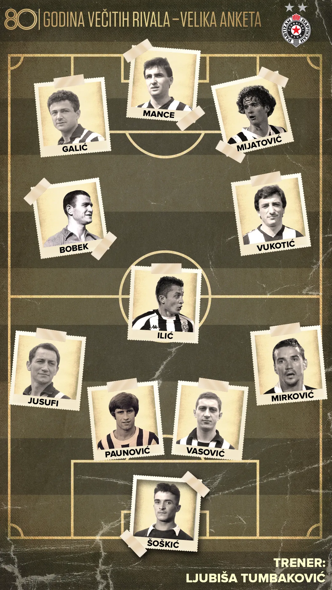 PARTIZANOVIH IDEALNIH 11 SVIH VREMENA U IZBORU PUBLIKE: Milutin Šoškić (62,0%) - Zoran Mirković (34,9%), Velibor Vasović (59,3%), Blagoje Paunović (38,5%), Fagrudin Jusufi (37,1%) - Momčilo Vukotić (87,6%), Saša Ilić (68,6%), Stjepan Bobek (74,8%) - Predrag Mijatović (36,6%), Dragan Mance (58,0%), Milan Galić (45,0%).