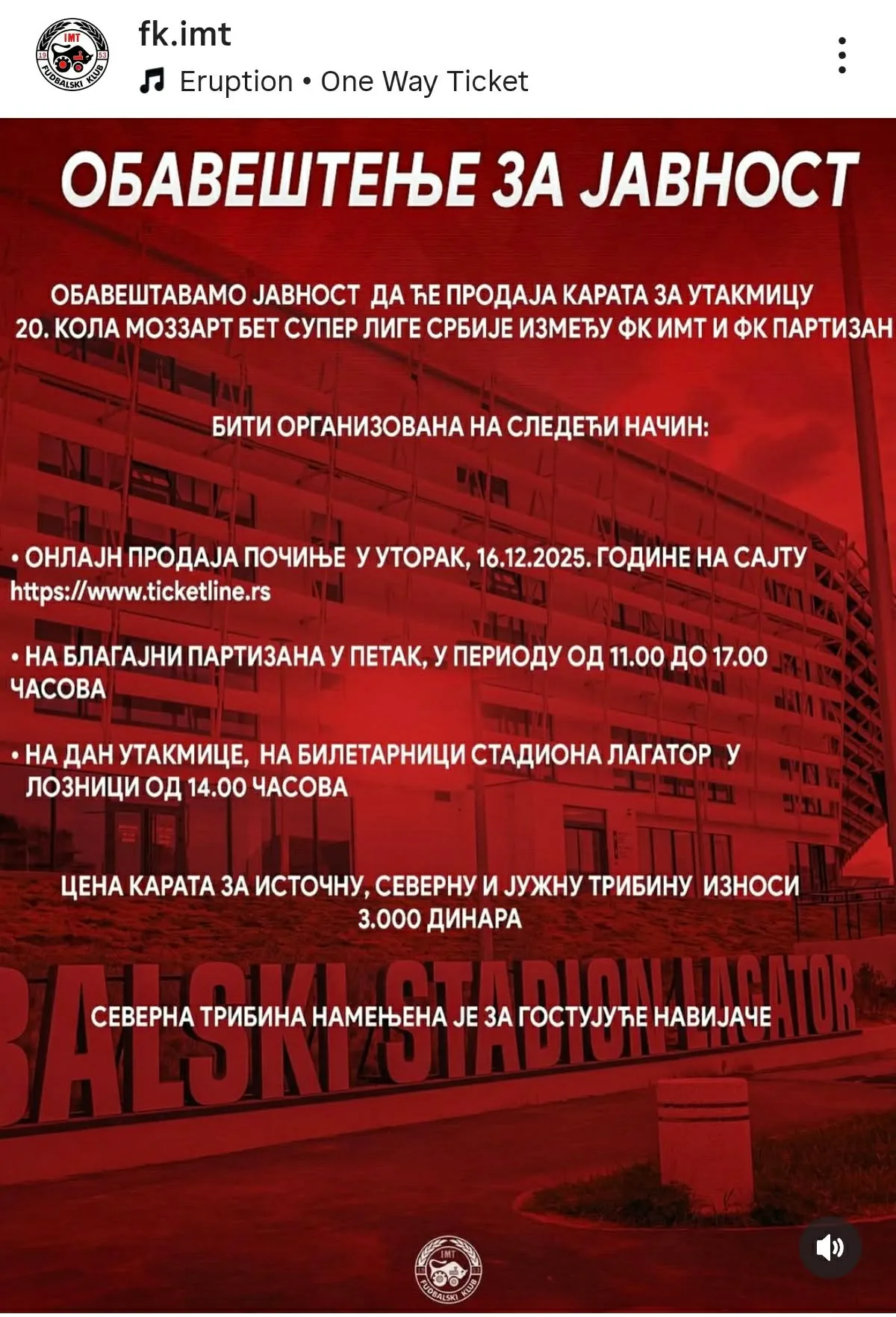 Poslednju utakmicu prvog dela sezone Partizan igra u Loznici. Gostuje IMT-u 20. devembra (18.00) s ciljem da trijumfom osigura zvanje jesenjeg prvaka Srbije. Umeli su Traktoristi tokom 2024. godine da naprave problem crno-belima, u dva navrata im otkidali bodove, ali šest dana pred duel u oči upada jedan drugi detalj - cena ulaznica koju je odredio IMT.
