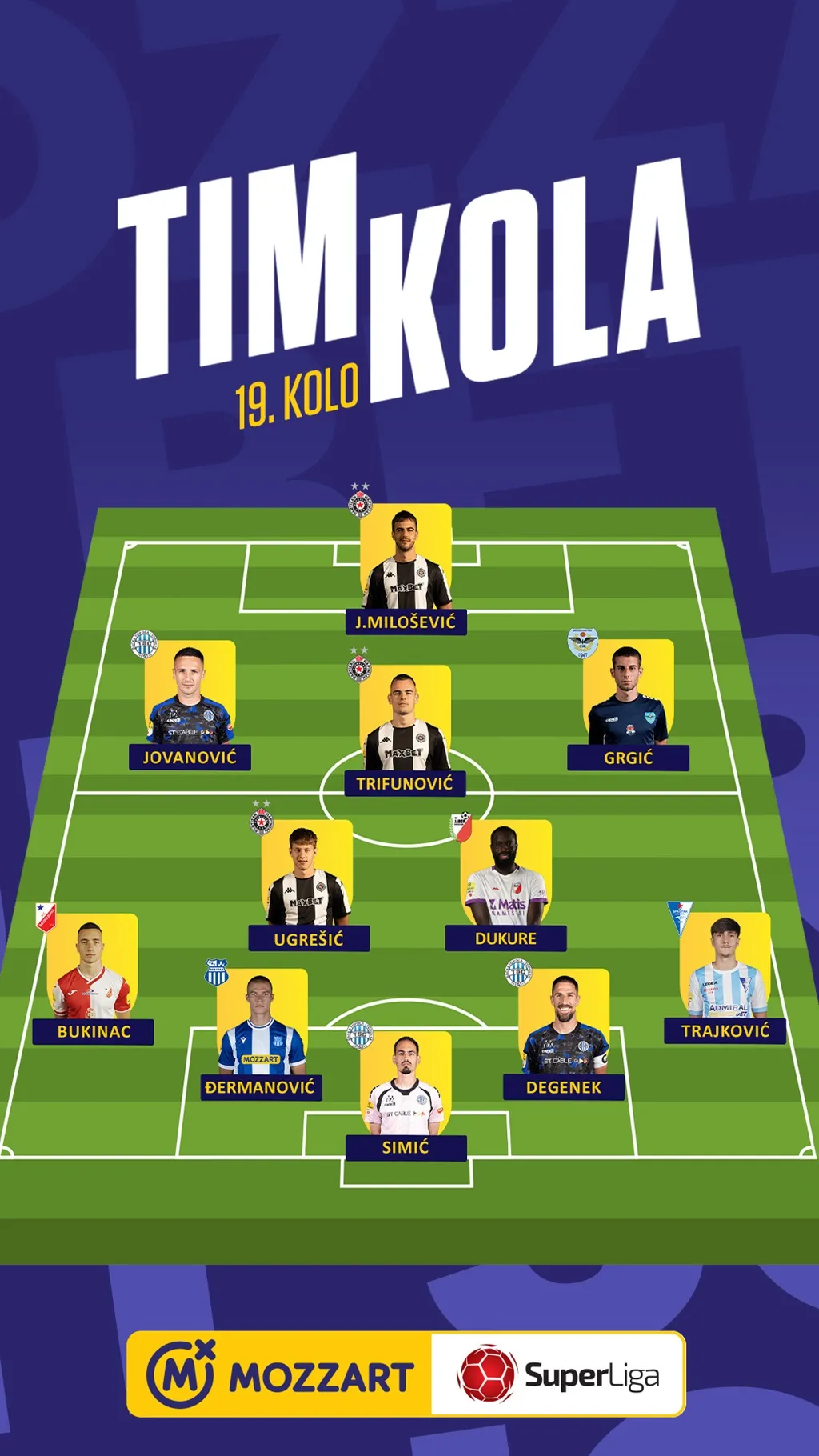 Prema tome, najbolji tim 19. kola Mozzart Bet Superlige u formaciji 4-4-2 izgleda ovako: Nikola Simić (TSC) 8 – Aleksa Trajković (Spartak) 7, Miloš Degenek (TSC) 7,5, Aleksandar Đermanović (OFK Beograd) 7, Stefan Bukinac (Vojvodina) 7 – Bubakari Dukure (Javor) 7, Ognjen Ugrešić (Partizan) 7,5, Dario Grgić (Železničar) 7, Nemanja Trifunović (Partizan) 8 – Saša Jovanović (TSC) 7,5, Jovan Milošević (Partizan) 7,5.