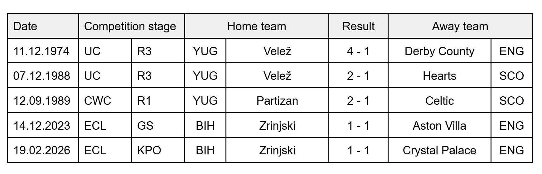 Treba još pomenuti da je 2021. Velež pobedio Kolerejn iz Severne Irske (2:1), međutim pošto njegov stadion nije ispunjavao Uefine standarde, taj meč odigran je Sarajevu, tako da se ne nalazi na ovoj listi.