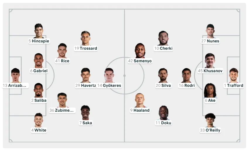 MANČESTER SITI (4-2-3-1): Traford – Nunes, Husanov, Ake, O'Rajli – Rodri, B. Silva – Semenjo, Šerki, Doku - Haland.