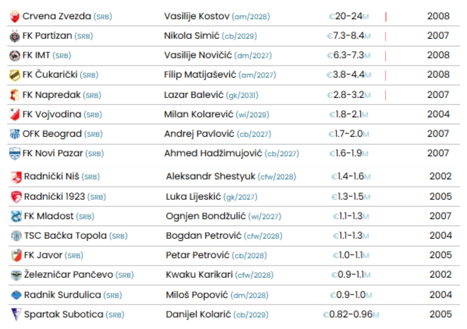 Zanimljivo je da Partizan na listi ima četvoricu svojih fudbalera od kojih je najvredniji Nikola Simić (7.900.000), a listu upotpunjuje Vasilije Novičić (6.800.000) od čije prodaje bi IMT mogao da napuni kasu.