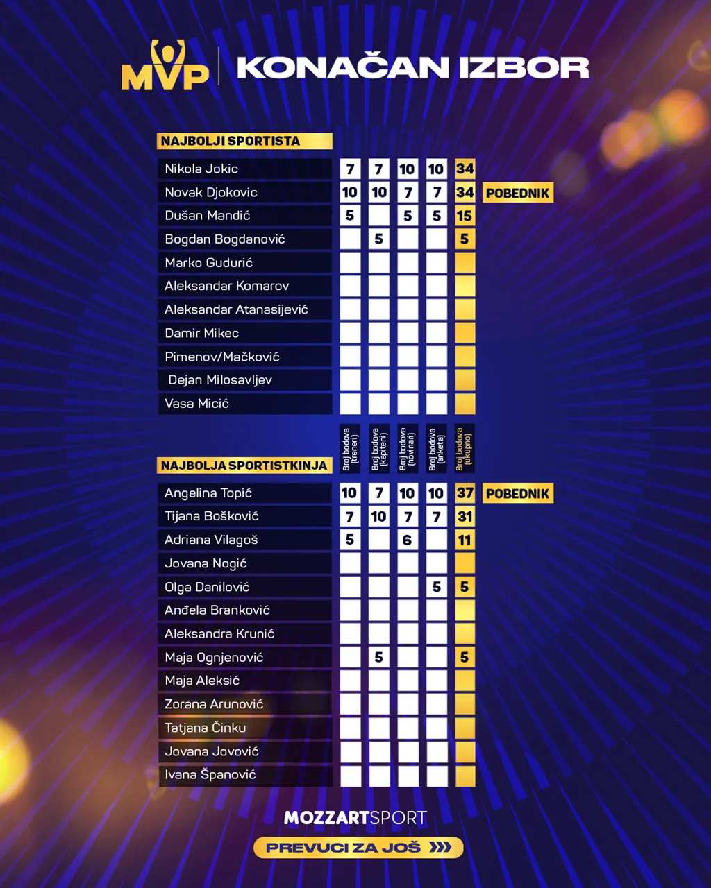 Napomenimo još jednom i ovo: u slučaju izjednačenog broja bodova presudni su glasovi trenera, a ovog puta to smo pravilo morali da primenimo samo kada je u pitanju bio izbor najboljeg sportiste, pošto su Novak Đoković i Nikola Jokić bili poravnati, ali je struka digla glas za najboljeg u istoriji tenisa.