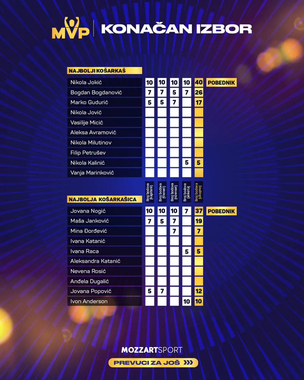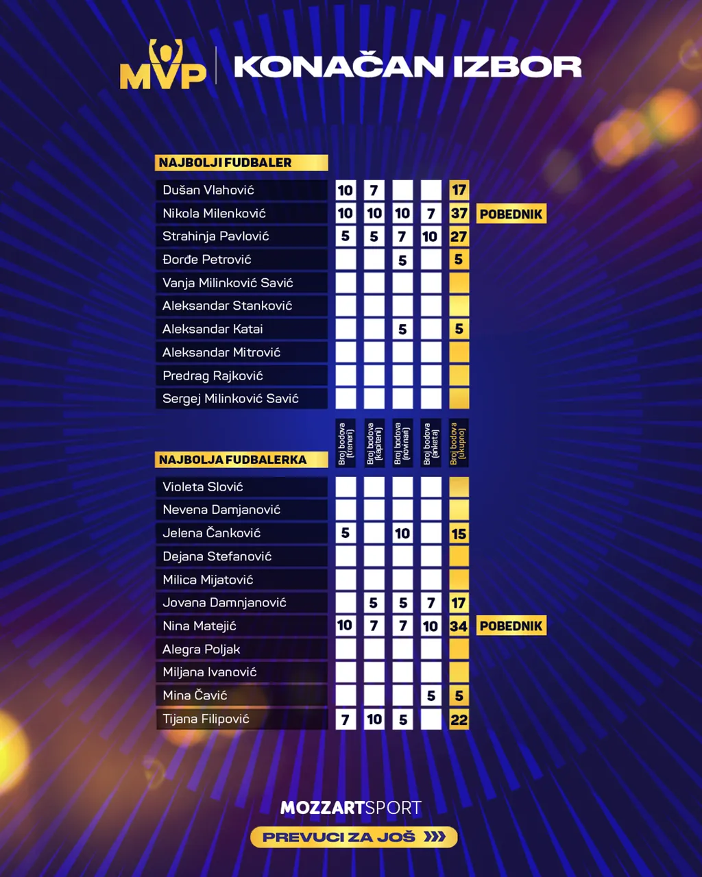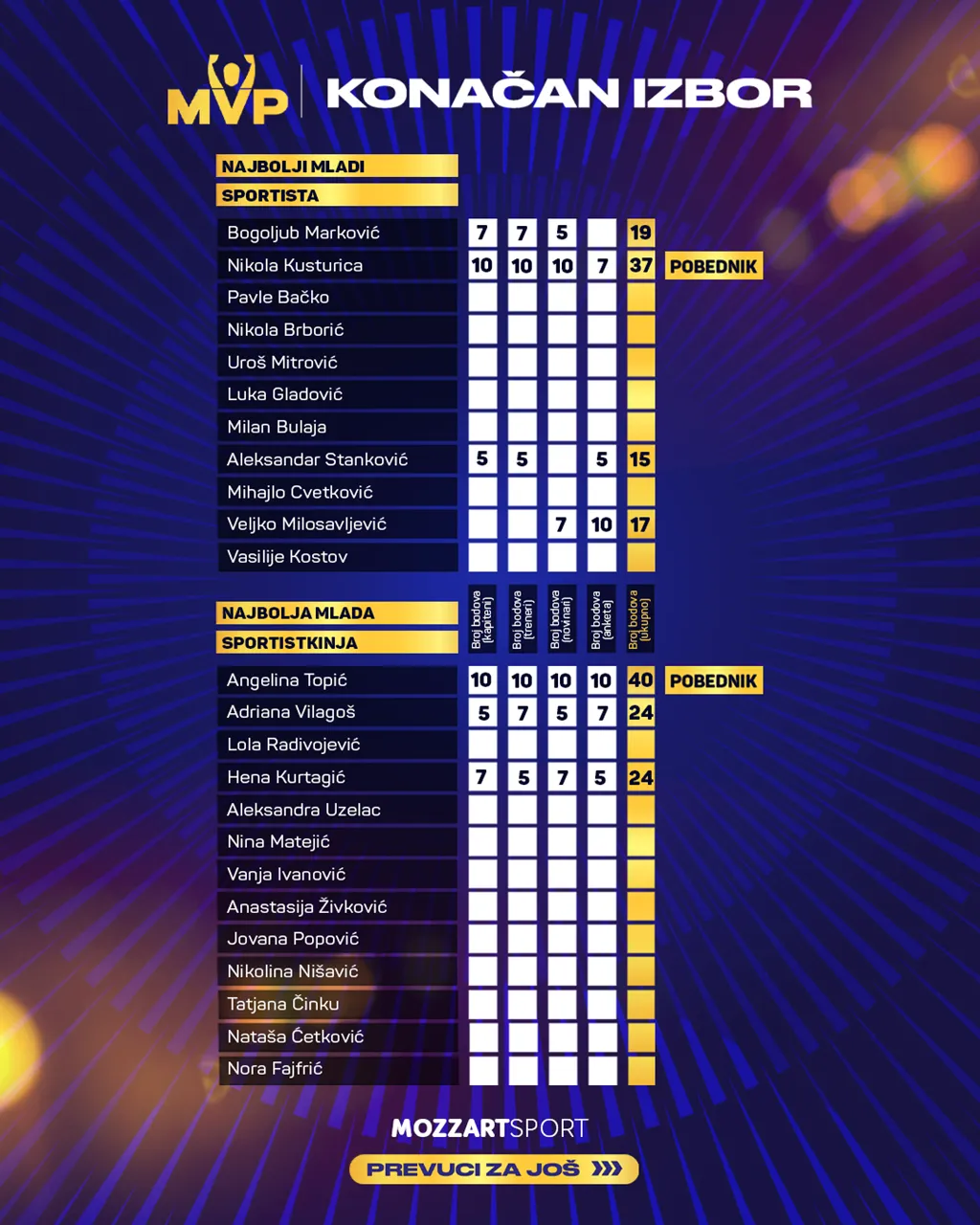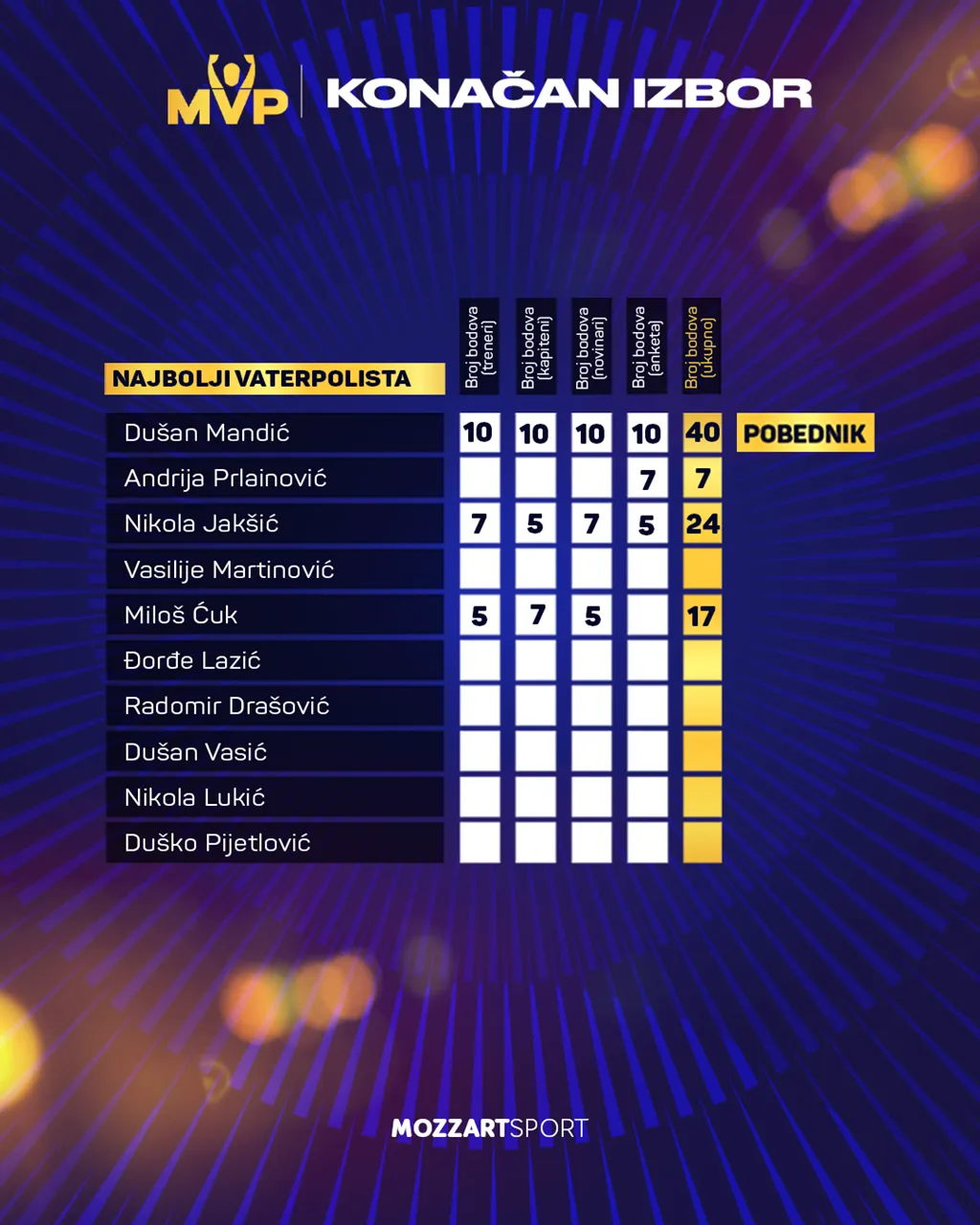 Uz podsećanje, poslednji put: najbolje među najboljima birali smo tako što su u ukupnom plasmanu sa po 25 odsto učestvovali glasovi trenera, pa kapitena svih najjačih srpskih klubova u ekipnim sportovima, po 25 procenata dali su novinari, a po 25 Vi, poštovani čitaoci Mozzart Sport portala.
