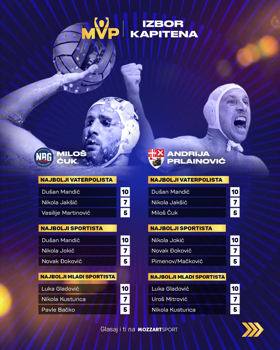 Glasove za najboljeg vaterpolistu u 2025. godini dobili su još Nikola Jakšić, Miloš Ćuk i Vasilije Martinović. Četiri imena za tri pozicije, nema mnogo razmimoilaženja.