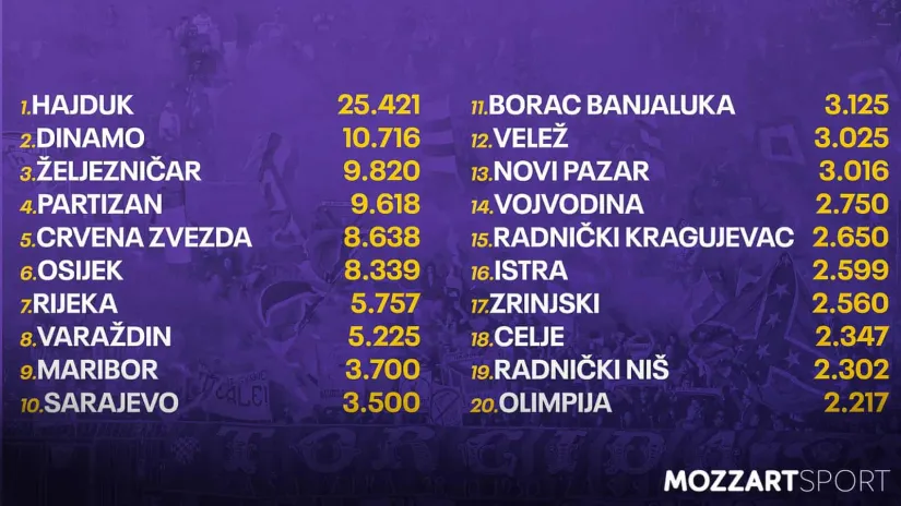 Poseta na stadionima u Ex-Yu: Hajduk planeta za sebe, šest srpskih klubova u Top 20