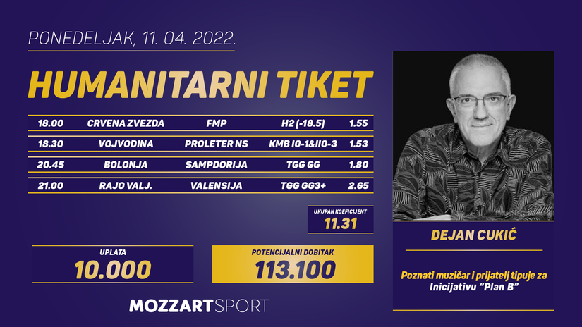 Nakon Darka Udovičića i Slaviše Koprivice priliku da odigra plemeniti tiket dobio je jedan poznati muzičar. Dejan Cukić podržao je MOZZARTOVO društveno odgovorno poslovanje, a potencijalni dobitak, u dobrotvornom listiću, usmerio za inicijativu PLAN B. Beograđanin Dejan Cukić je poznati muzičar, rok novinar i pisac. Objavio je više knjiga, a poznat je i kao voditelj programa na čuvenoj terasi posle velikih uspeha naših sportista, humanitarac…