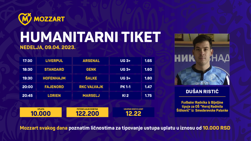 “Na FAJENORD –RKC VALVAJK igram PK 1-1 i na Olimpik MARSELJ KI 2”, završava tipovanje Dušan Ristić, koji potencijalni dobitak od 122.200 dinara usmerava za OŠ “Heroj Radmila Šišković” iz Smederevske Palanke.