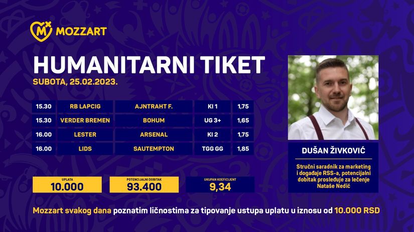 Dušan Živković će na plemenitom tiketu u RS, s istom igračkom kombinacijom kao i u Srbiji potencijalni dobitak proslediti na adresu Crvenom krstu, Prijedor. MOZZART kvota je ista, a potencijalni dobitak zaračunat je na osnovu svakodnevne kompanijske uplate od 100 konvertibilnih maraka.