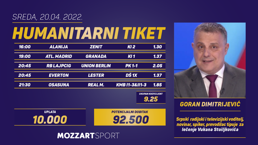 Današnji Mozzartov dobrotvorni kladilac ovako je sastavio plemeniti tiket: