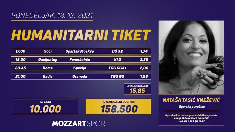 Pevaće operska diva Nataša Tasić Knežević u “Kombank dvorani”, 19. ovog meseca za pomoć stanovnicima Petrinje i ostalih mesta u Hrvatskoj koja su doživela razaranja nakon zemljotresa. Međutim, ona će pre nego što se to desi, uraditi još jednu veliku stvar – donela je odluku da u MOZZART izazovu tipuje baš za njih. Prođe li današnji listić,158.500 dinara, prosledićemo akciji obnove kuća na Baniji “Krov nad glavom”.