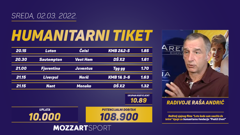 Humanitarni tiket u podne: Radivoje Raša Andrić tipuje za humanitarnu fondaciju “Podrži život”