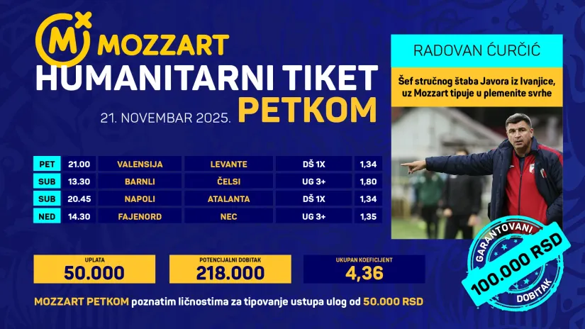 On je trener od formata, on je bio selektor Orlova, on je legenda Javora iz Ivanjice, šef struke čije se ime ne da pomešati ni sa jednim drugim… Zadovoljstvo nam je da vam prikažemo kladilački izbor Radovana Ćurčića, koji od nas dobija 50.000 dinara za tipovanje, i naravno 100.000 dinara zagarantovane dobitne sume.