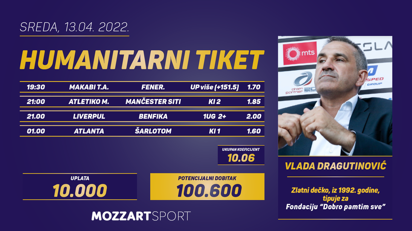 Podsećamo na MOZZART – ove dobrotvorne kladioce u “Humanitarnom tiketu u podne” sa iznosima od preko 100.000 dinara. To su: Andrea Trinkijeri, Ivan Jović, Strahinja Gavrilović, Vanja Bulić, Momčilo Bajagić, Uroš Tripković, Radomir Antić, Vojin Ćetković, Vojkan Borisavljević, Zdravko Čolić, Jovan Maljoković, Nenad Stojmenović, Sara Sakradžija, Milan Caci Mihailović, Miloš Teodosić, Danica Ristovski, Dimitrije Ilić, Marko Tejić, Srđan Vasiljević, Milica Mandić, Branislav Trifunović, Predrag Miljuš, Dragana Cvijić, Boris Režak, Duško Pijetlović, Prof. Branko Đurović, Duško Nikolić, Zoran Vujičić, Milan Pavkov, Ana Joković, Ivica Šurjak, Emir Kusturica, Aleksandar Srećković, Nikola Mišković, Dejan Mišković, Zoran Višić, Ljubiša Stojanović, Milan Mačvan, Nenad Brnović, Ivan Paunić, Dejan Ristić, Milena Pavlović Čučilović, Antun Novaković, Pero Antić, Ivan Ivković, Brajs Džouns, Nebojša Vučićević, Darko Tešović, Aleksandar Simetrija Đorđević, Zoran Njeguš, Milan Zelen, Predrag Jeremić, Igor Gluščević, Slavoljub Krnjinac, Mirko Milikić, Mladen Krstajić, Vanja Savić, Vladimir Lučić, Danilo Nikolić, Olja Lević, Milovan Ćirković, Danilo Anđušić, Moka Slavnić, Marko Baćović, Radivoje Lale Bojičić,Vladimir Jocović, Goran Bjelogrlić, Nenad Nerandžić, Bojan Todorović, Momir Rnić, Milica Zarić, Dušan Marković, Žarko Paspalj, Boris Pingović, Miloslav Samardžić, Vuk Saletović, Ivana Ilić, Nina Radovanović, Damir Mikec, Predrag Kolarević, Petar Grašo, Strahinja Rašović, Stefana Veljković, Predrag Kolarević, Đorđe Pejak, Ivana Katanić i Bianka Buša.