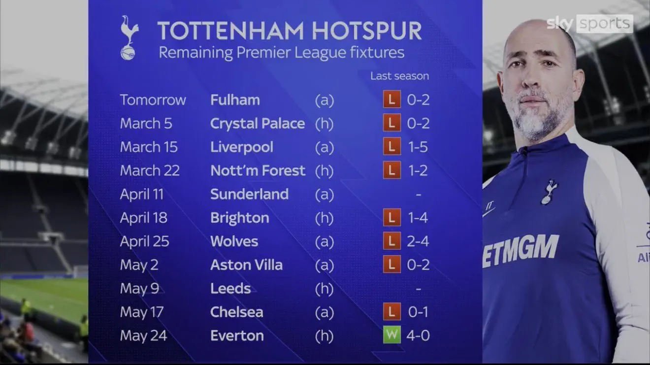 Rekao bi neko da mu i raspored ide na ruku budući da od članova velike šestorke igra još samo sa Liverpulom i Čelsijem, ali... Britanske kolege su nedavno podsetile da je Totenhem protiv predstojećih rivala na terenima na kojima će sa njima igrati do kraja aktuelne sezone prošle takmičarske godine osvojio svega tri boda. Sva tri kao domaćin protiv Evertona.