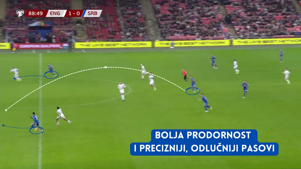 Treba istaći da je Nikola Milenković rano uposlio Dušana Vlahovića odličnom dugom loptom, dok je Strahinja Pavlović inače sjajan u vođenju lopte i napredovanju sa loptom, ali u ovom sistemu to nije mogao da radi jer bi se otvorila opasna rupa u odbrani. Sve to ukazuje da je Srbiji na toj poziciji verovatno bio potreban drugačiji profil igrača – neko prepoznatljiv po direktnijoj i progresivnijoj distribuciji lopte poput Aleksandra Stankovića, koji u Klub Brižu već rutinski obavlja takvu ulogu.