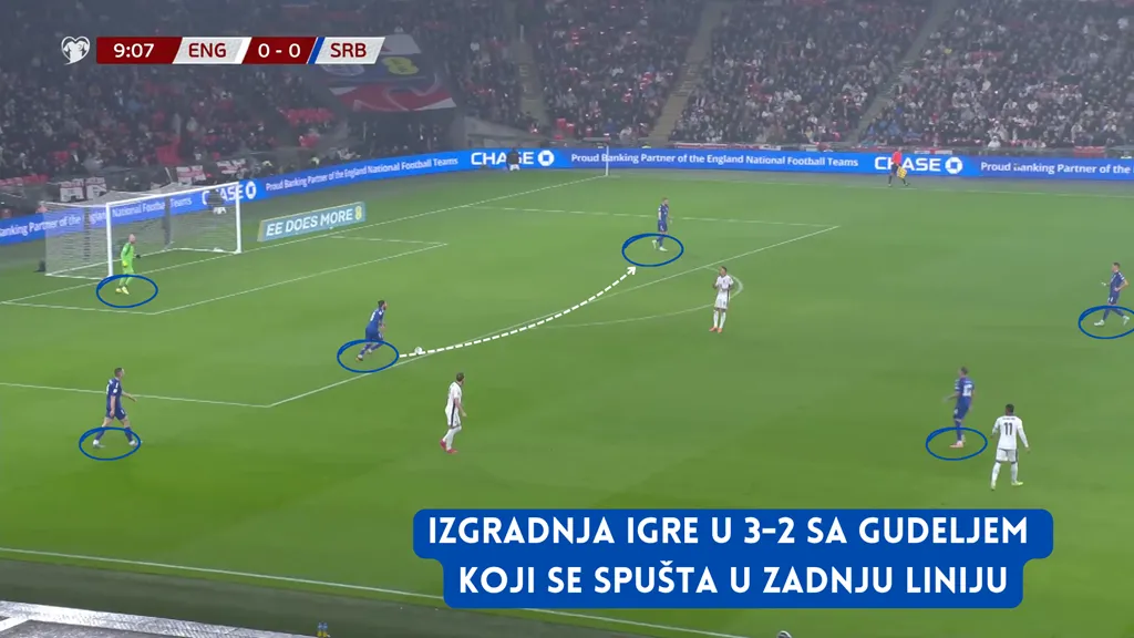 Paunovićeva ideja bila je da se igra gradi u sistemu 3-2-5, sa Nemanjom Gudeljom koji se spušta kao treći štoper. Gudelj je imao solidnih 89% tačnih dodavanja, ali samo jedna od dve duge lopte je stigla do saigrača. Problem je u tome što je Srbija u prvom delu utakmice tražila kvalitetniji izlaz iz odbrane, a Gudelj nije igrač koji to može da pruži. On je igrač sa specifičnim kvalitetima, još uvek relevantan, ali uglavnom voli da igra sigurno.