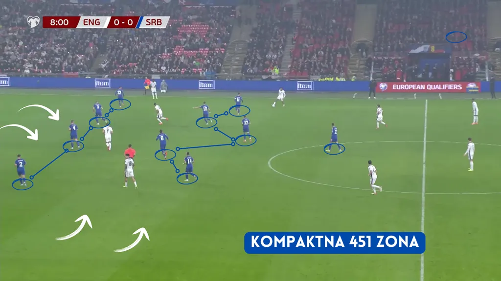 Paunović je iznenadio formacijom, koja je bila hibrid između 4-3-3 i 4-2-3-1, pri čemu je Srbija uglavnom branila u uskoj 4-5-1 postavci. Definitivno nismo pritiskali visoko, ali nismo ni bili u niskom bloku, ne dozvoljavajući tako Englezima da natovare pritisak. Ideja je bila da se Englezima dozvoli prostor samo po boku sa suprotne strane i u zadnjoj liniji, i u prvom poluvremenu taj plan je uglavnom dobro funkcionisao.