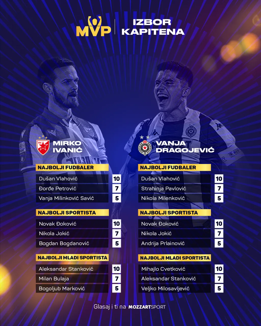 Mirko Ivanić – koji nažalost ne može da bude među nominovanima jer je uslov da ima pravo igranja za Srbiju – te Vanja Dragojević, uglavnom kapiten Partizana dok Bibars Natho ne kroči na teren, saglasili su se recimo da je ove godine najbolji naš fudbaler bio – Dušan Vlahović. I njemu su uručili po 10 bodova, dok su se mimoišli oko preostalih kandidata. Ivanić je sedam bodova dao Đorđu Petroviću, a pet Vanji Milinković Saviću, dok je Dragojević nagradio Strahinju Pavlovića i Nikolu Milenkovića.