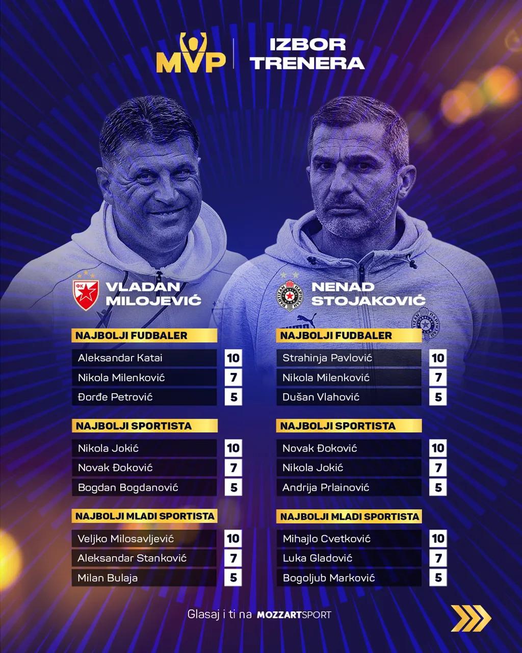Anketa je otvorena i za ljubitelje sporta, a kako su glasovi trenera i kapitena već stigli i sabiraju se dok pričamo, red je da polako počnemo podgrejemo atmosferu uoči svečanog uručenja priznanja MVP Mozzart Sport za najbolje srpske sportiste u 2025. godini.