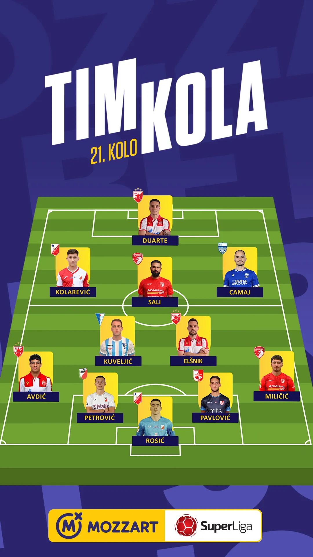 Idealni tim 21. kola Mozzart Bet Superlige čine: Rosić (Vojvodina) 8 - Miličić (Radnički KG) 7, Pavlović (Radnički Niš) 7, Petrović (Javor) 7,5, Avdić (C. zvezda) 7 - Elšnik (C. zvezda) 7, Kuveljić (Spartak) 7 - Camaj (Novi Pazar) 7,5, Sali (Radnički KG) 8, Kolarević (Vojvodina) 7,5 - Duarte (C. zvezda) 7,5.