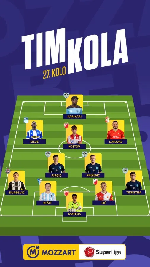 Najbolji tim 27. kola Mozzart Bet Superlige (4-2-3-1): Mateus (C. zvezda) 8 - Tegeltija (Železničar) 7, Sič (Vojvodina) 7, Bešić (Spartak) 7, Đurđević (Partizan) 7 - Knežević (Železničar) 7,5, Pirgić (Železničar) 7,5 - Lutovac (Napredak) 8, Kostov (C. zvezda) 7,5, Silue (OFK Beograd) 7,5 - Karikari (Železničar) 8.