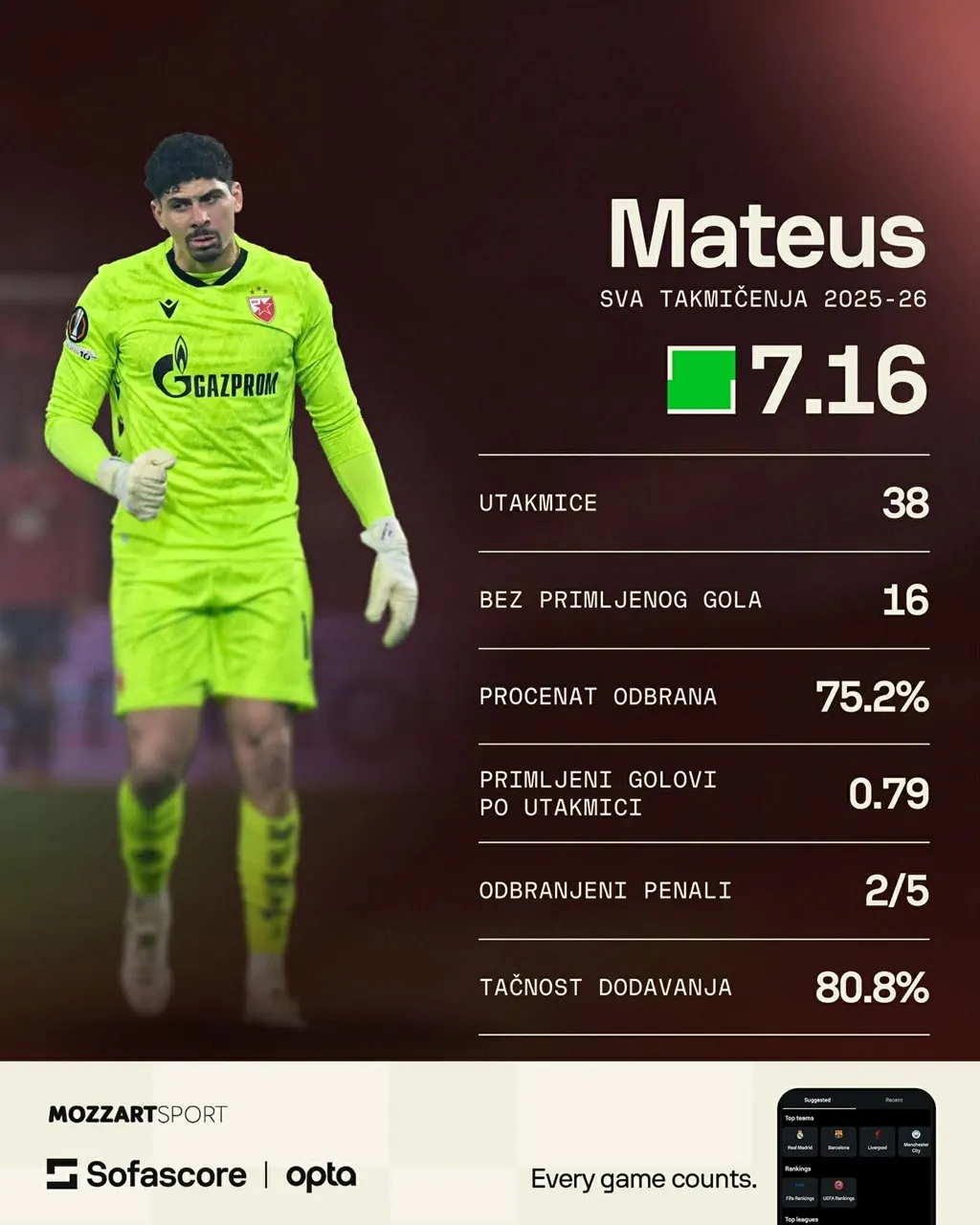 Od dolaska u Crvenu zvezdu Mateus je sakupio 38 nastupa, od kojih je u 16 bio nesavladan. U sedam mečeva tokom 2026. samo je dvaput matiran (1:1 Selta, 3:1 Čukarički), a podsetimo, crveno-beli su ove godine već igrali tri utakmice u Ligi Evrope i derbi sa Partizanom... Prosek golova koje prima po utakmici je manji od jednog (0,79), a odbrana visokih 75,2 odsto. Odbranio je dva penala od pet (protiv Partizana i Linkolna), dok odličnu igru nogom potvđuje čak 80,8 odsto preciznih dodavanja. Tu su i česta istrčavanja, kako na centaršuteve, tako i van kaznenog prostora, što pokazuje dobru koncentraciju brazilskog golmana.