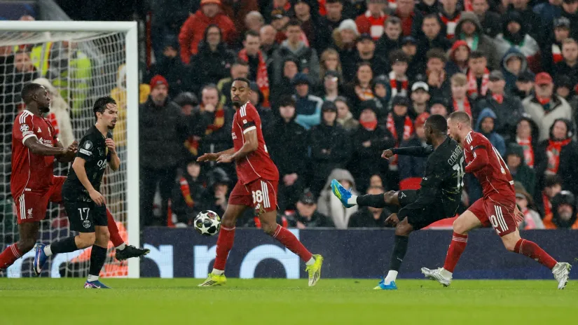 Zagrmeo je Enfild od starta, dobili su Redsi ozbiljan vetar u leđa u svojih navijača, međutim u polju nisu uspeli da uspostave prevlast. Arne Slot je shvatio da opit iz Pariza ni u ludilu ne sme da ponovi, vratio se na formaciju sa četvoricam igrača pozadi, čime je dobio pre svega na kakvoj-takvoj defanzivnoj stabilnosti, što ipak nije bilo dovoljno da se zadrži ona žar u atmosferi kultnog stadiona sa početka utakmice.