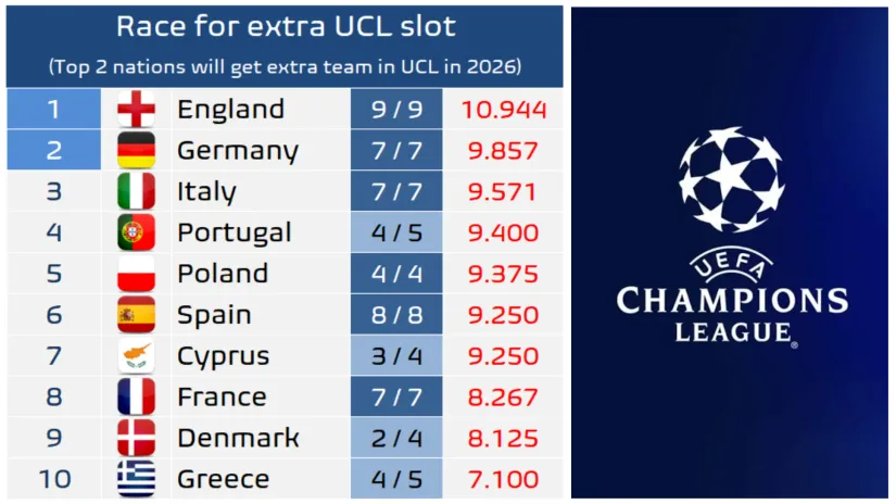 Podsetimo, u prošloj takmičarskoj godini za pet predstavnika u eliti izborili su se Englezi i Španci, dok su za narednu, uz Engleze, bonus mestu trenutno najbliži Nemci i Italijani. Razume se, promene su i te kako moguće, ali ako u obzir uzmemo aktuelne pozicije na tabelama, trendove i formu, deluje da bi Bundesliga i Serija A definitivno mogle da ostanu glavni kandidati i u drugom delu sezone.