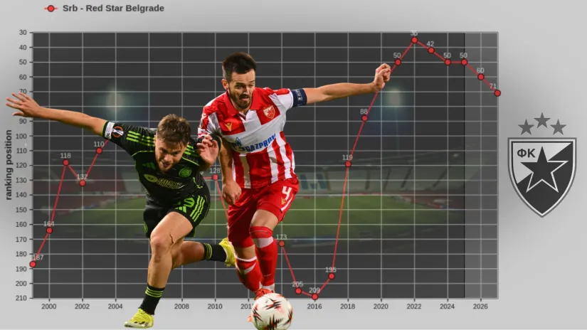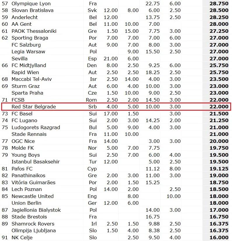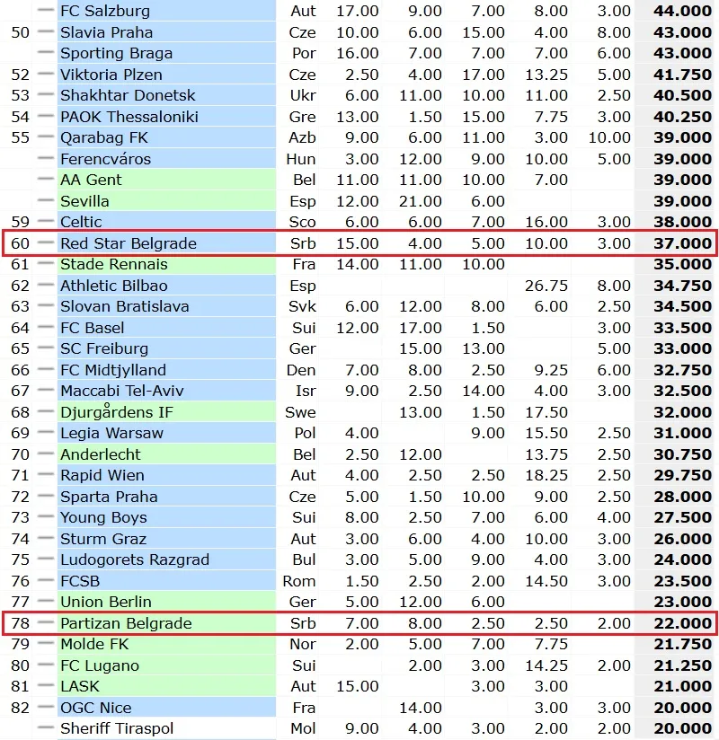 Ne zaboravimo, najtrofejniji srpski klub pre samo tri godine nalazio se na istorijsko visokoj 35. poziciji, i s ukupnim petogodišnjim koeficijentom (46,000) imao osiguran povlašćen status u svim kvalifikacionionim rundama, čak se prošle godine ušunjao u treći šešir pred žreb Lige šampiona; sa sadašnjih 37,000, a prema situaciji sa starta tekuće sezone, ta brojka ne bi bi bila dovoljna za status nosioca u plej-ofu za elitno takmičenje. Kao što možete da vidite na slici iznad, poslednji povlašćeni klub - Seltik - imao je koeficijent 38,000.