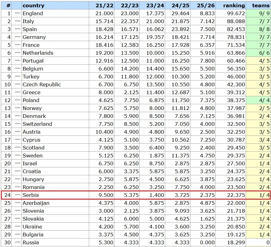 Od leta 2023. do danas Srbija je skliznula 13 mesta na Uefinoj rang listi. U potonje tri sezone skupa, osvojili smo svega 7,500 bodova. Koliko je to loš učinak najbolje govori podatak da smo samo u jednoj, 2021/22, uzeli 9,500, a najgore od svega jeste to što nam upravo ta najjača sezona sledeća ispada iz obračuna.