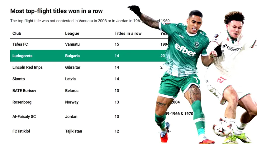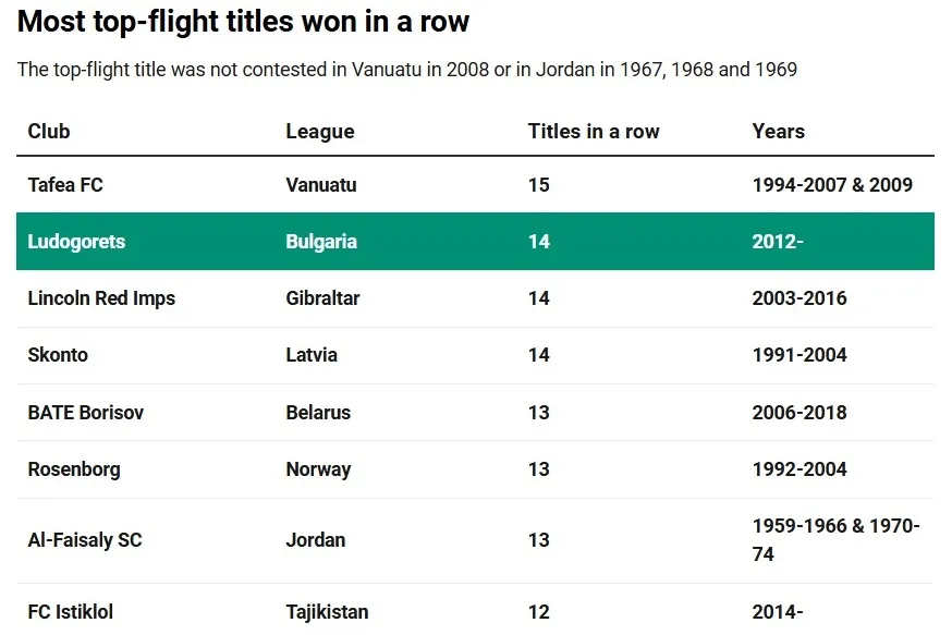 Valja podsetiti da je svetski rekorder po broju uzastopnih osvojenih titula malo poznati klub Tafea iz Vanuatua sa 15 kruna. S trona ga je svrgnuo Amikale 2020. godine. Uz Ludogorec, 14 vezanih šampionata osvojili su Linkoln sa Gibraltara i počivši Skonto iz Rige, dok po naslov manje u svojoj niski imaju beloruski BATE Borisov, Al Fajsali iz Jordana i norveški Rozenborg.
