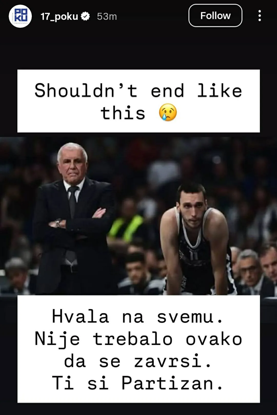 "Hvala na svemu. Nije trebalo ovako da se završi. Ti si Partizan", poručio je popularni Poku na svom instagram profilu.