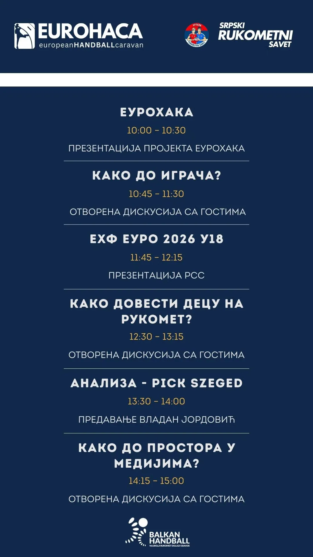 Jedan od projekata koji će biti predstavljen jeste i inicijativa Srpskog rukometnog Saveta „EUROHACA“, čiji je cilj prikupljanje i transfer znanja iz najuspešnijih rukometnih zemalja, kao i dodatno osnaživanje domaćeg trenerskog kadra kroz razmenu iskustava i savremenih metoda rada.